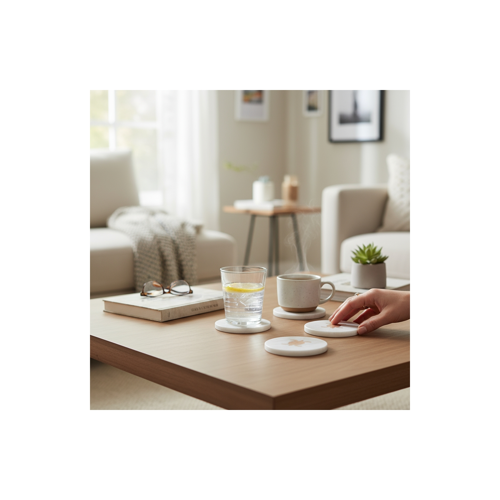 These heavy, durable coasters stay put — no more sticking to the bottom of your glass! Each features anti-skid pads on the underside to protect your furniture from scratches and provide stability. Perfect for hot or cold beverages, these coasters combine style, craftsmanship, and practicality in every piece.