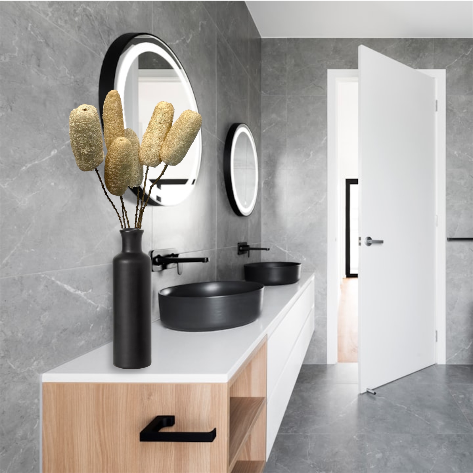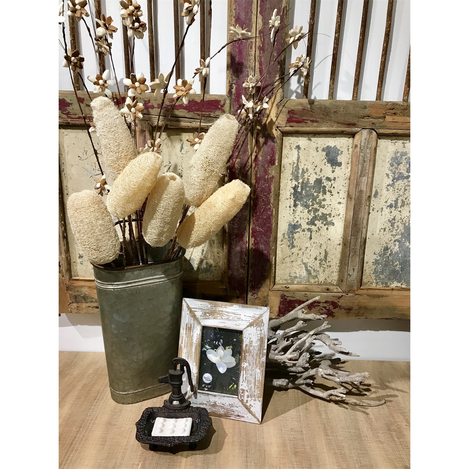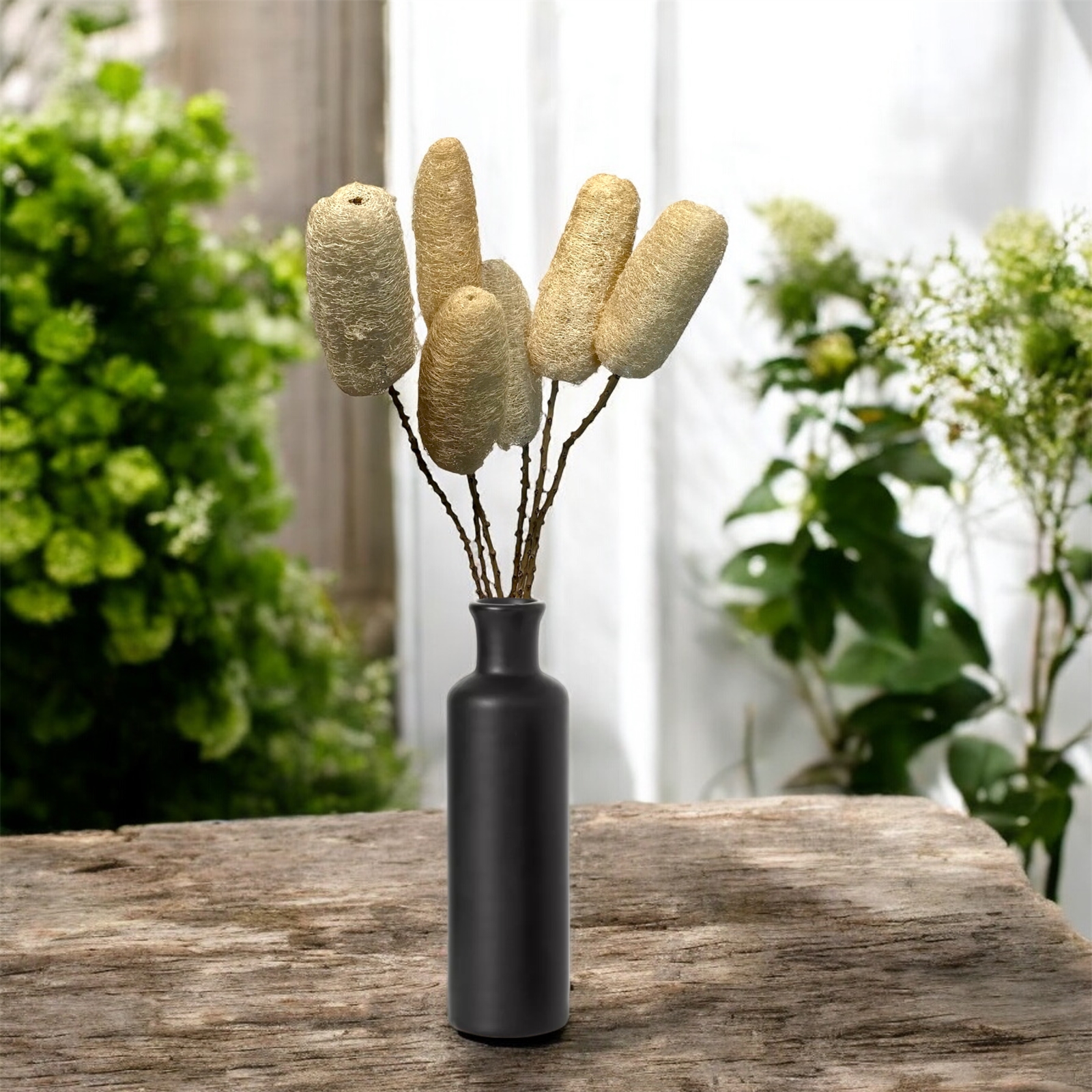 Bring the beauty of nature into your home with our 6 Stem Natural Luffa Berries Drop-In Bouquet. Each berry is carefully harvested and assembled in India, showcasing its unique golden beige tones and organic texture. The bouquet measures approximately 20” tall, with each luffa berry ranging from 4-6” long. Bleached Natural Preserved Foliage. Ideal for use as a stunning accent in bathrooms, dressing areas, or any space in need of a touch of nature. Display it in a tall vase for a sophisticated arrangement or separate the stems to mix and match with other dried florals to create your own look. Whether used as a decorative piece in a bowl on the sink or displayed solo in a vase, these natural luffa berries will add a refreshing, spa-like ambiance to your home. Perfect for Mothers Day, Christmas, Fall, Thanksgiving, Valentines Day, Everyday.