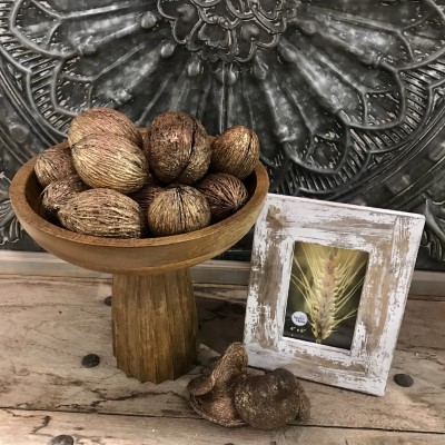 Elevate your home decor with our 14 Piece Natural Mintola Ball Seed Pod Bowl Filler. Each pod is a beautifully dried, oval-shaped nut shell with a deep, dark brown hue and a textured surface reminiscent of coconut shells. Measuring approximately 2 to 3 inches long, these pods offer a sophisticated, organic look that’s perfect for use in rustic, farmhouse, or modern settings.