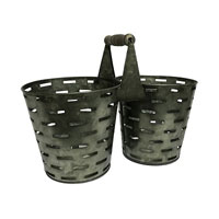 Introducing our double handle olive bucket planter a compact and versatile solution for displaying two 6 Grower-Size pots. Made from heavy gauge galvanized metal with a dark grey graphite patina finish this planter exudes elegance and durability. The wood spindle bridge handle adds a touch of charm and makes carrying effortless. Imported for superior quality. Dimension: 13.25x6.5x9h.