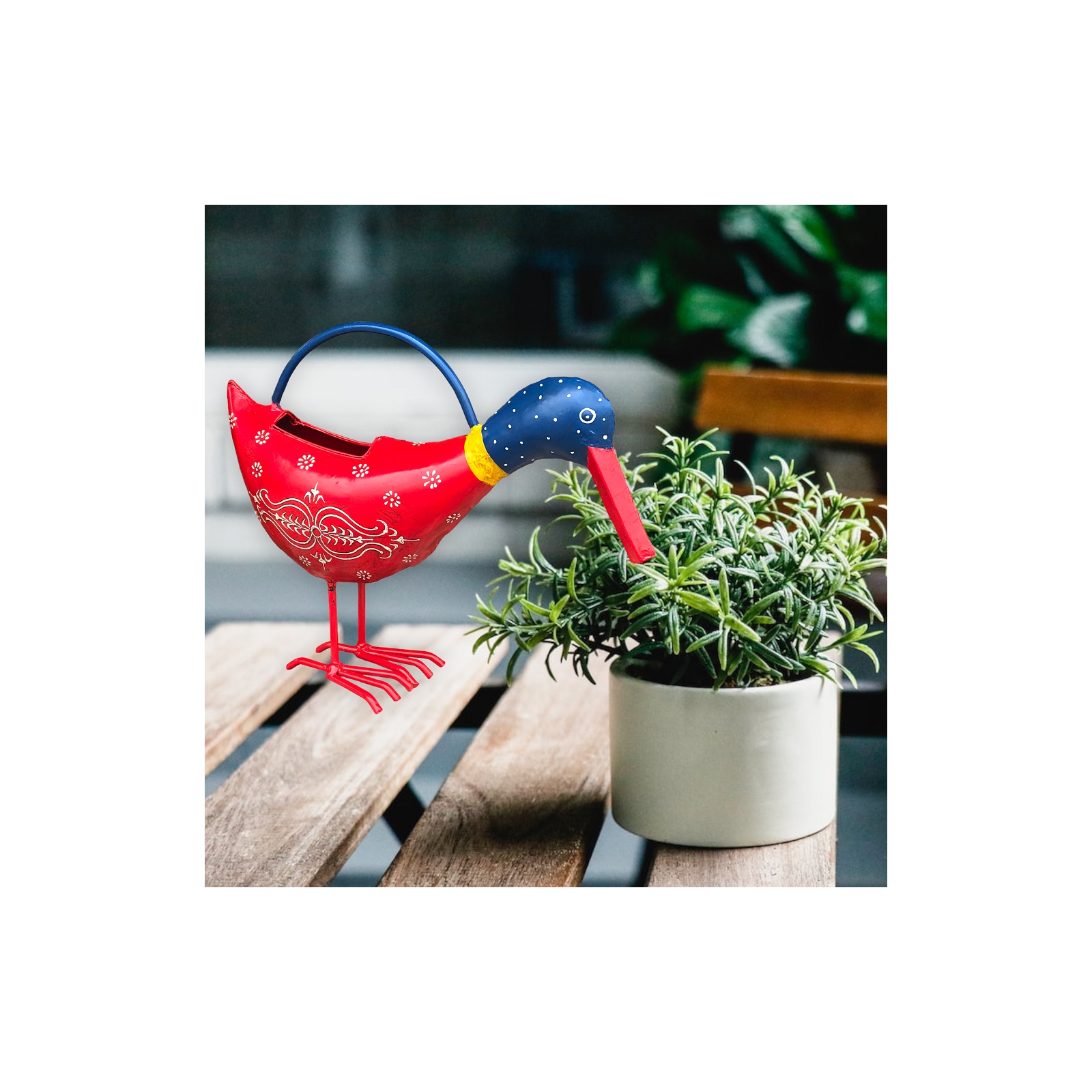 Introducing the newest addition to the Plant Pal family - the Red Bandana Duck Water Can! Hand-crafted in India by skilled artisans this water can is made of sturdy sheet metal and features a striking red and blue design with intricate henna details.