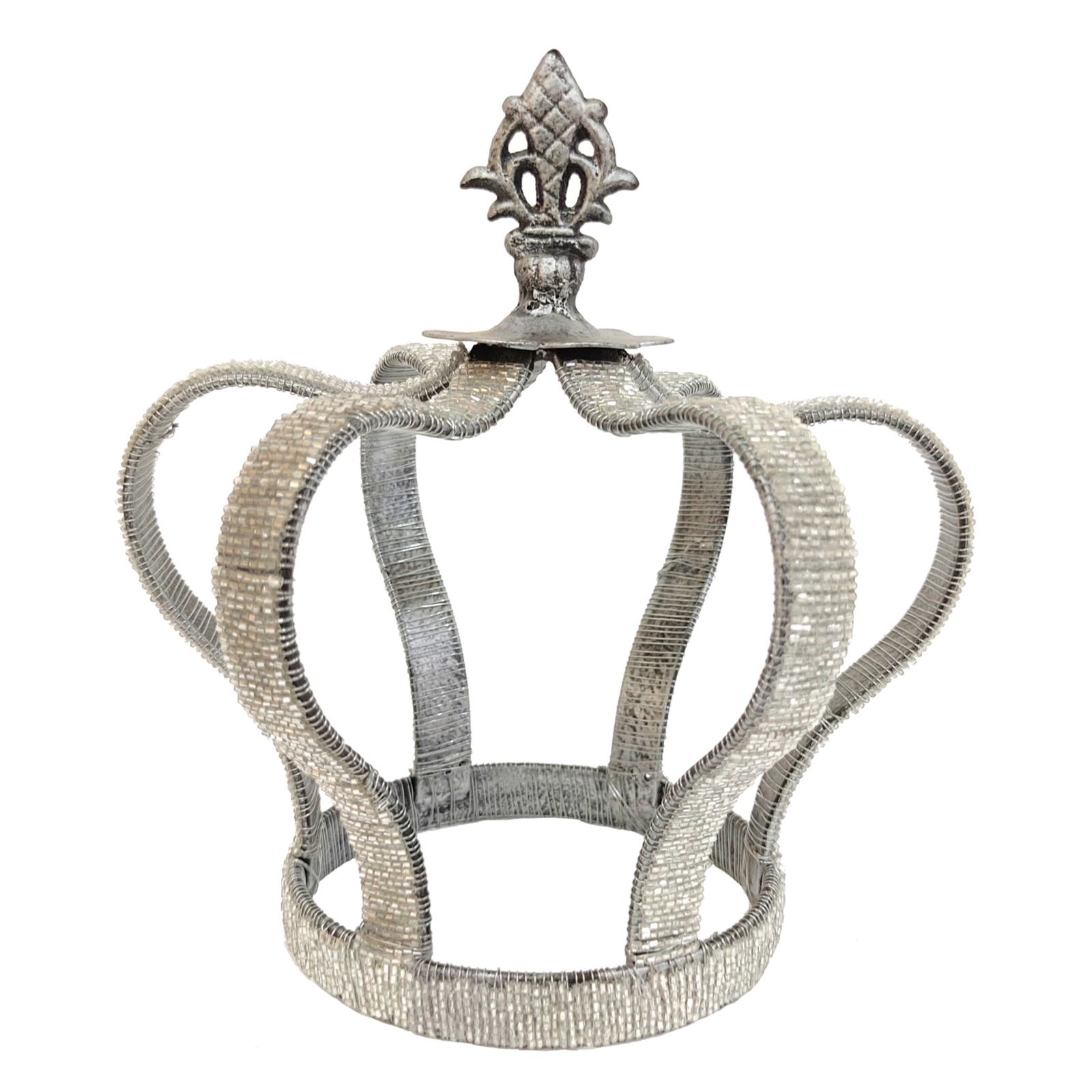 Introducing the exquisite hand-beaded iron Sovereign Crown Table Ornament meticulously crafted in India. Each crown is a labor of love meticulously adorned with dazzling metallic jeweled beads available in two stunning options: Majestic Antique Gold (item 62083) or Platinum/Silver Finish (shown).