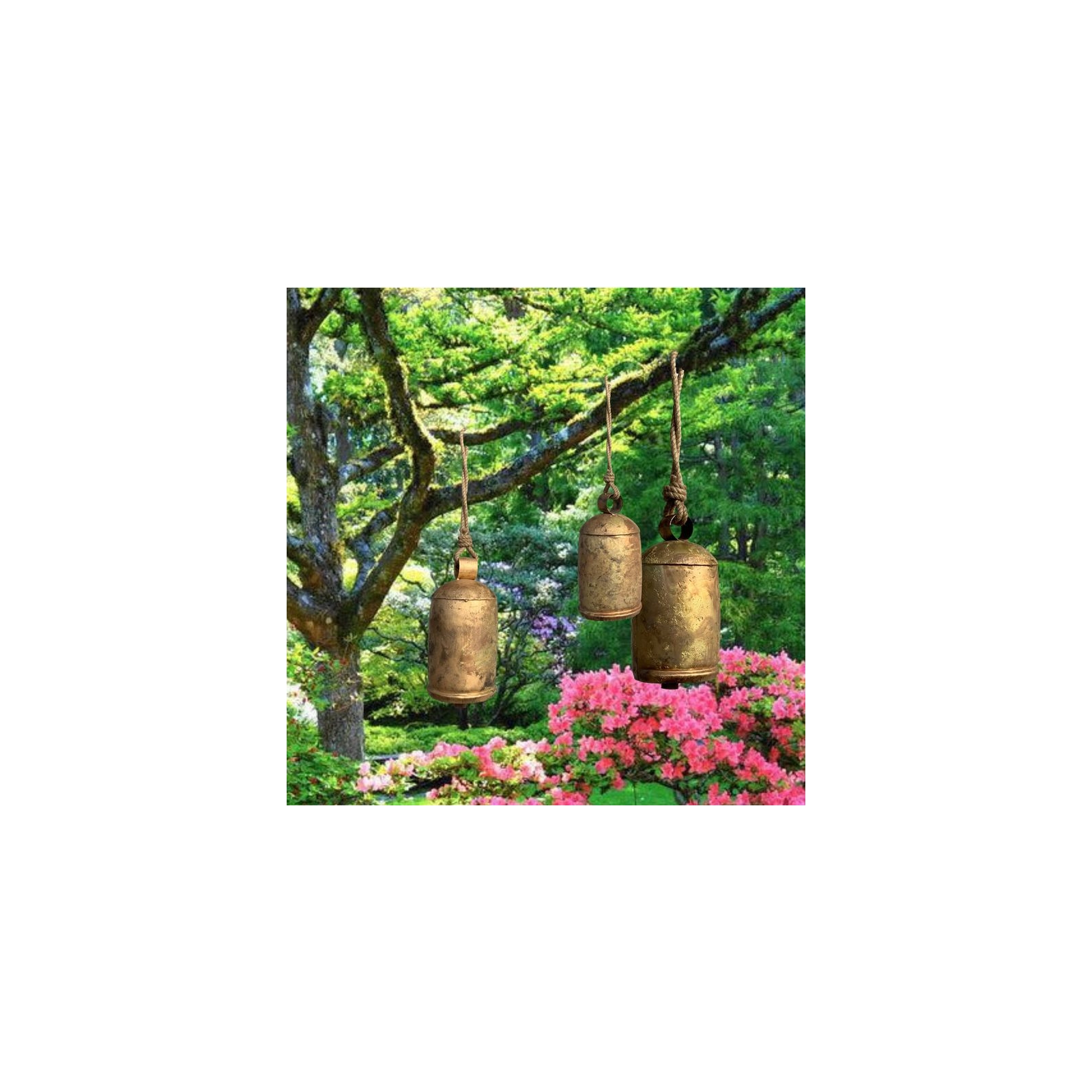 Set of three magnificent oversized meditation bells skillfully handcrafted in India using recycled sheet metal. These bells designed to captivate and inspire are the perfect addition to any garden setting. Whether suspended from a pergola gazebo or nestled within the branches of an ancient oak tree they exude an air of tranquility and elegance.