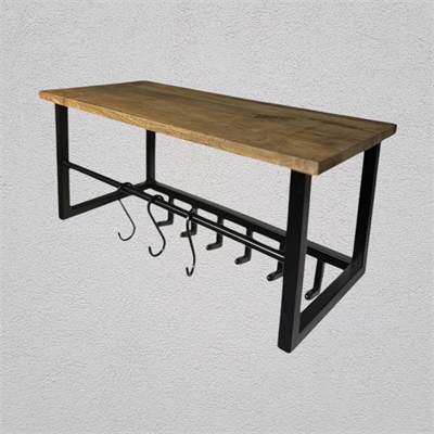 Ashton Three Tier Utility Wall Shelf with 4 Stationary J Hooks. One Piece Iron Construction with Mango Wood Shelves in Honey Stained Finish. Versatile Unit perfect for Kitchen, Bath, Mudroom and Laundry Room