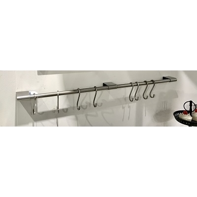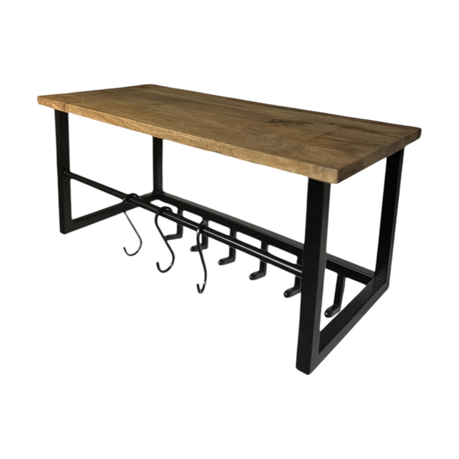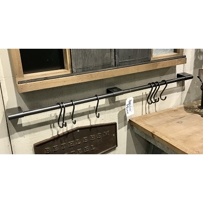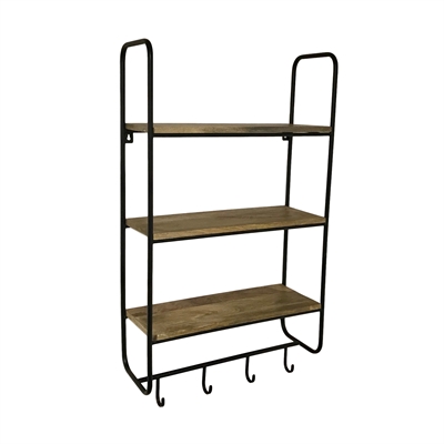 Denali Wood and Metal Wall Shelf offers sturdy organization for your kitchen, bath, laundry room or garage! Honey stained mango wood top. Sturdy one-piece metal frame in dark coffee baked on finish. Includes 3 removable S Hooks to hold pots and pans, towels or tools.